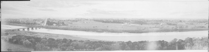 This photograph shows the Manawatu River and the Fitzherbert Bridge. Palmerston North is visible in the background on the left side.