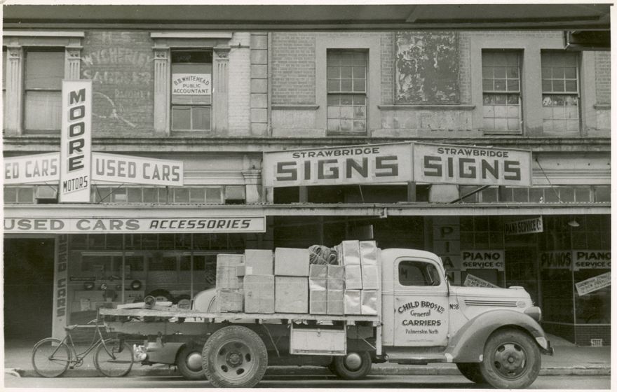 The Child Bros Ltd General Carriers Palmerston North truck is seen in front of the Britannia Buildings, corner of George and Main Streets. Amongst the tennants in the buildings are H.S. Wycherley Saddlery, Moore Motors, B.B. Whitehead Public Accountant, Strawbridge Signs and a piano servicing company.
