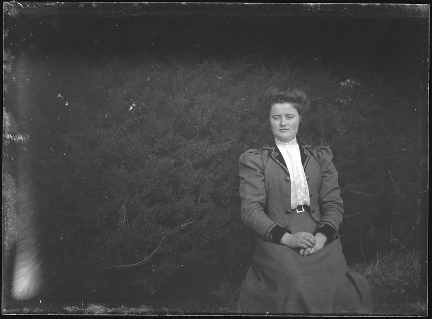 This photograph was created by William James Young in the early 20th century. A large variety of subjects are depicted in the collection, but family, rural life and travel are the most prominent themes. The exact location of the photographs in the Young Collection is unknown, but W J Young lived on a farm in Mt Stewart, Rangitikei, and some of the photographs include his house. The Young family were apparently avid travellers and photographs later in the collection feature scenes from Rotorua, Auckland, Whanganui, as well as other unidentified locations. The portraits are all unidentified, but are presumably of members of the Young family. The photographers parents were George Henry (b 1833) and Jane McDowell (b 1842, d 1916). They came to New Zealand in 1877. The same year, they bought the home farm on Mt Stewart and called it Kilrudden after Kilrudden House, the home of the McDowell family in Ireland. The couple had four children: Ann (b 1873), Margaret (b 1876), John (b 1878) and William James (b 1880). William James married Mary Elizabeth Thompson and they had four children: Doris (b 1914, d 1989), George (b 1916, d 1991), Royden McDowell (b 1925, d 1992) and Noel William (b 1927, d 2013).