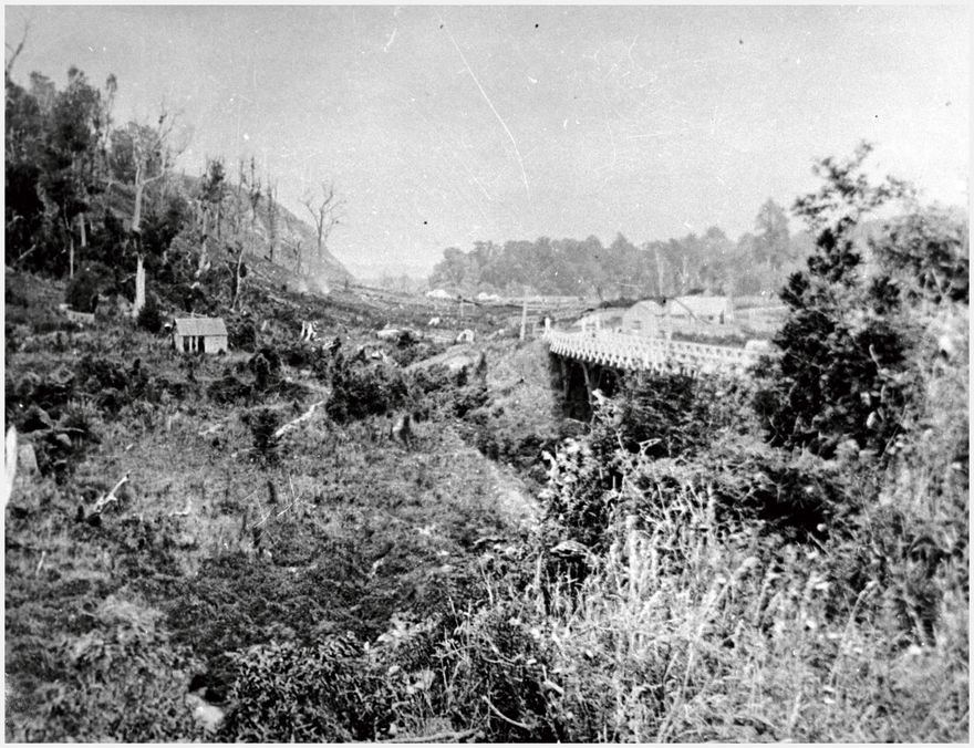 The Gorge road opened in 1872, and in 1875 when the bridge was built the Government established a tollhouse at the Woodville end to defray the cost of maintaining the road. In 1912 tolls were abolished, the tollhouse was demolished and the small settlement which grew up around the tollhouse disappeared. The telegraph pole on the left of the bridge shows that this photograph was taken after 1879 and the absence of the railway line indicates it was before 1891.