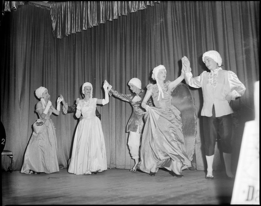 This image was not published in The Manawatu Evening Standard, taken September, 1959. Unidentified group during a display of dance crazes through the ages.