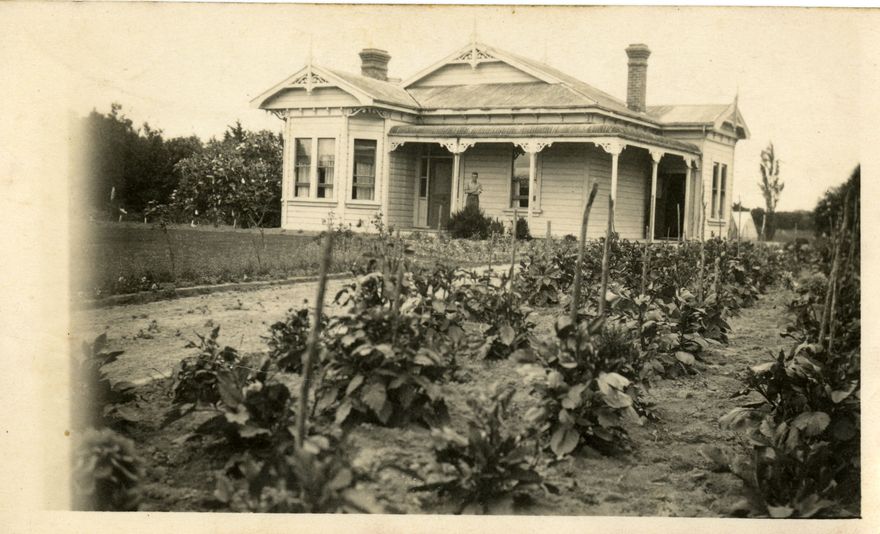 The Shailer home at 2928 Albert Street, Palmerston North. Horace or Len Shailer may be the individual standing in front of the house. Reserve reads: "One of the early dahlia beds showing the home"
