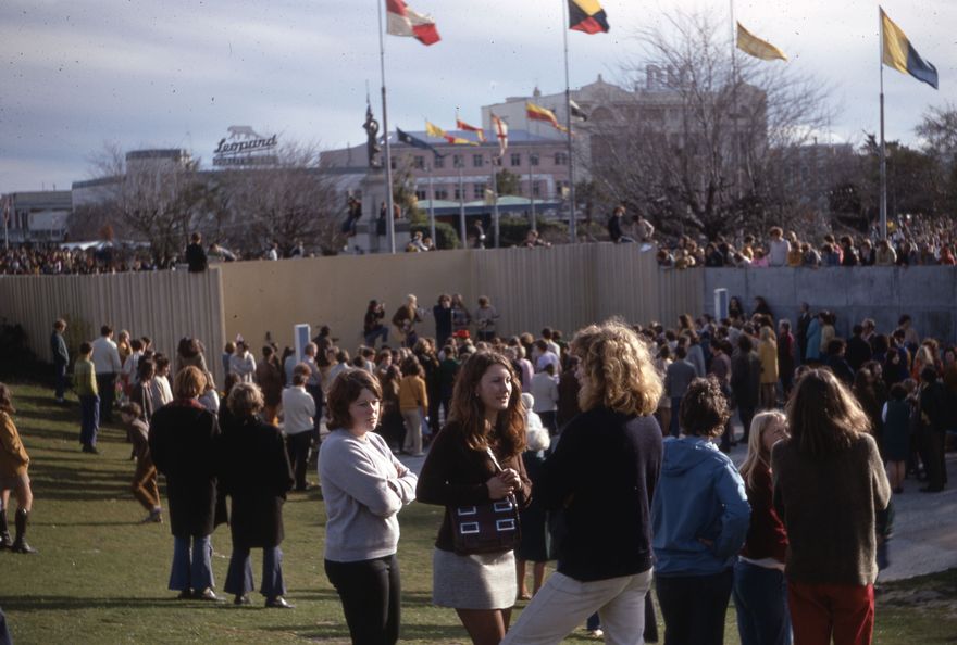 Crowds are gathered for a parade or event in the Square. The photograph was taken from the raised berm of the Lion's Den looking towards the Commercial Hotel, and the D.I.C.