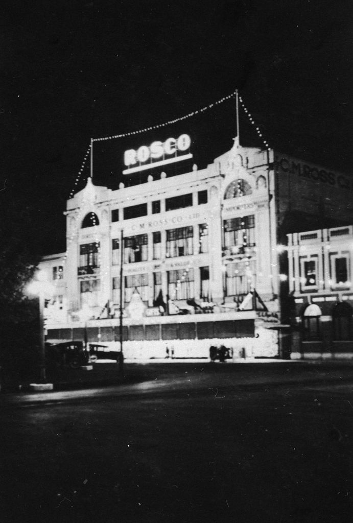 This photograph shows the C M Ross Co building with Christmas decorations. C M Ross, or Roscos, was one of the foremost department stores in Palmerston North. This building was constructed in 1927-1928 to replace a number of buildings on The Square, serving as C M Ross.