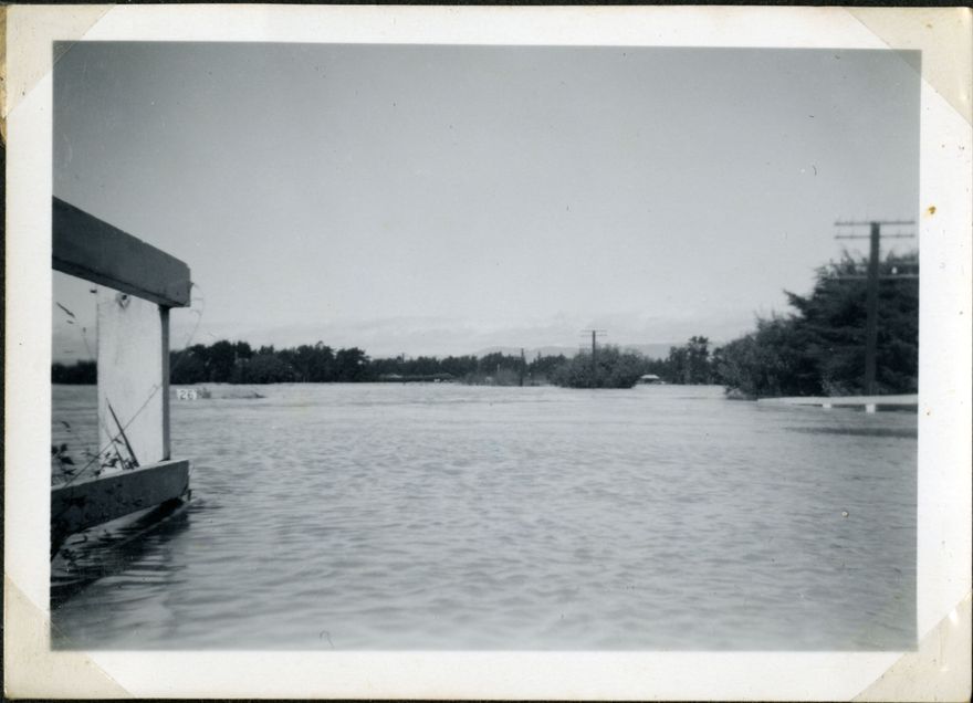 This photograph shows Bourke's Drain during a flood at Rangiotu, one of the largest floods for the Oroua River on record. The photograph was taken on the main road looking towards Palmerston North and was taken when the flood was nearing its peak.