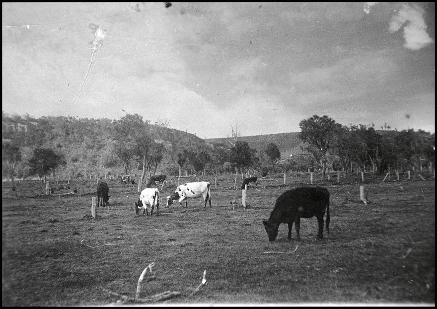 Shown here are cows grazing on the Rifle Range at Hokowhitu, Palmerston North, beyond which can be seen the hills in fitzherbert (now the Summerhill area of Palmerston North). This land is now part of the Manawatu Golf Club.
