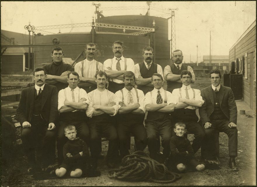 The first Gasworks for Palmerston North were built by John Coates and Co. and opened in 1889. The Palmerston North Gas Company Ltd bought the Gasworks in 1891, and ran the operation until it was sold to the Palmerston North Borough Council in 1915. This photograph shows staff outside the gasometer at the Gasworks. H.J. Kennedy, Manager, is at the extreme left in the front row. Second from right, back row is thought to Bill Smith.