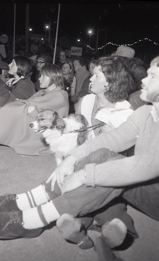 This image was taken (but not used) for a story that ran in The Manawatu Evening Standard on the 1st of May 1970. "Two thousand people sat and stood in front of the Palmerston North Clock Tower last night and sang “We Shall Live in Peace” as the climax to probably the biggest protest march held in Palmerston North.”