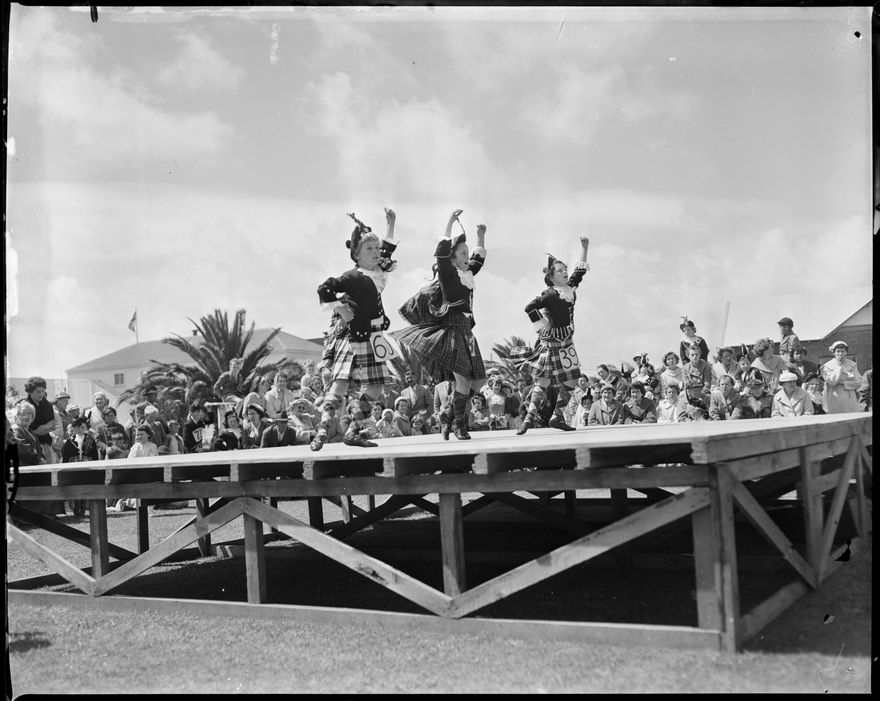 This image was taken for a story that ran in The Manawatu Evening Standard on 9 November, 1959. "Three children in the eight and under 10 years Highland Fling work hard to impress the judges in the Highland dancing competitions at the Royal Show." Another photo associated with the article was published on the 9 November, 1959.
