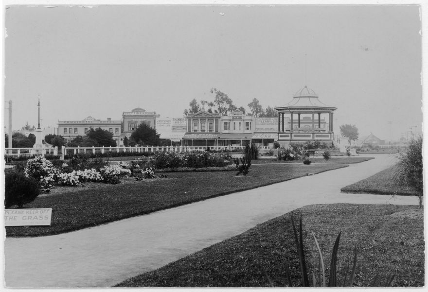 This is a photograph of the Square, oriented towards the portion of the Square between Main Street West and Church Street West. The buildings, from left are: Provincial Hotel (burned down in 1906 and was replaced by the Grand Hotel, now the Grand Cafe and Bar), Daily Times, J Mortensen (watchmaker and jeweller), R Hannah Boot, W Park (bookseller), R Leary (chemist), Leary and Dixon ('The Home of Music') and an unidentified building that was once J Linton's Land Office. The original band rotunda is the prominent feature on the right side of this photograph. On the left is a sign which reads, "Please Keep Off The Grass".