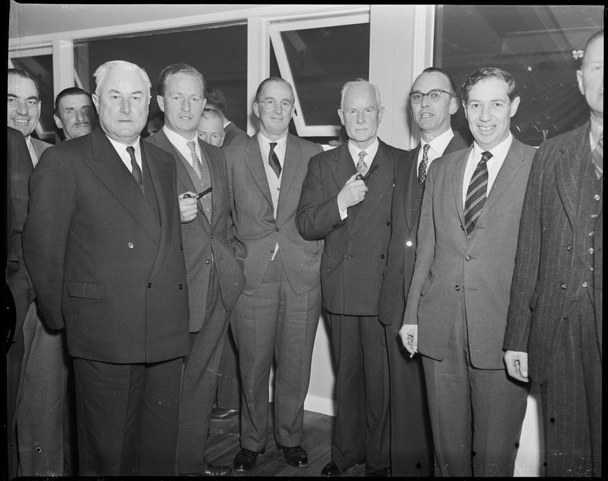 This image was taken for a story that ran in The Manawatu Evening Standard on 12 August 1960 "The new premises of Messrs Jolly and Mills Ltd., in Princess Street, were officially opened by the Mayor (Mr. G.M. Rennie) at a function held in the new building yesterday. Photographed during the function were (from the left): Messrs A. Harris (director and general sales manager for Todd Motors, Ltd.). A.M. Jolly, R.H. Carmichael (general manager for Europa Oil, N.Z., Ltd.), R.T. Cadwallader (production manager for Todd Motor Industries, Ltd.), J.K. Warren (executive manager for Todd Motor Industries, Ltd.), and M.C. Maris (a director of Todd Motors, Ltd.)."