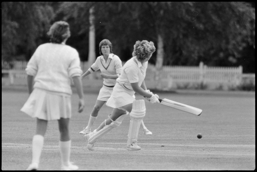 This image was taken (but not used) by the Evening Standard on 19th of January 1982. It depicts Manawatū Women’s cricket team taking on the International Australian Women’s team in a limited over warm-up match for the Hansell's Vita Fresh Women's World Cup 1981/1982. The match was held at Ongley Park in Palmerston North. The Australian team won by 202 runs. The match report ‘Aussies too polished in all facets’ was written by Ford Watson and published the next day: