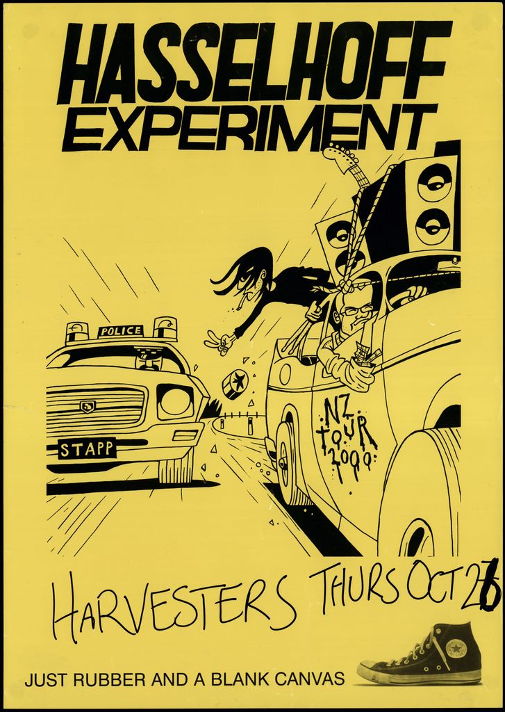 Hasselhoff experiment, police stapp, NZ tour 2000. Harvesters, Thurs Oct 26. Just rubber and blank canvas. Part of a collection of posters that were displayed at The Stomach, Lombard Street, Palmerston North venue for Creative Sounds Society Incorporated.