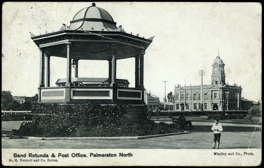 A boy stands by the Band Rotunda, with the newly constructed Post Office, on the corner of Main Street, behind. This first Band Rotunda was built in The Square in 1899. It was shifted to The Esplanade in 1907, and replaced by another, which was demolished to make way for the Hopwood Clock Tower in 1956.