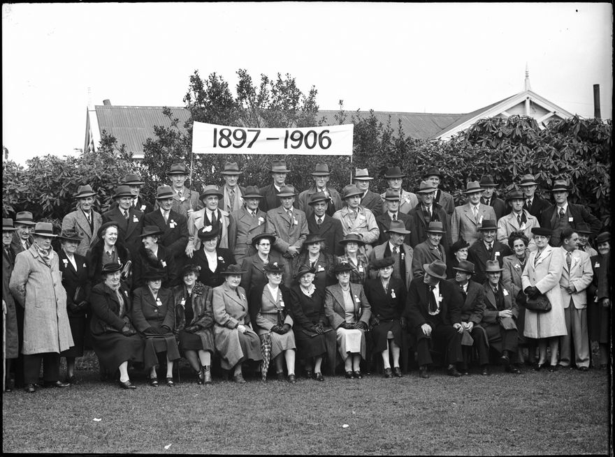 Students who attended Nireaha School during 1897 - 1906, at what is thought to be the 50th jubilee. Nireaha is a small district located near Eketahuna. The School opened in 1897 with two class rooms and 21 pupils. It closed in 2001.