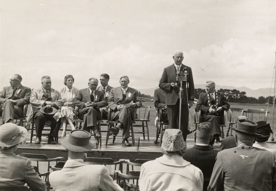 The first International Agricutural Aviation Show was held at Milson Airport, Palmerston North, 9 - 10th November, 1956. Over 60 aircraft attended and a crowd of 2000 were entertained with a fly-pass of 64 planes. The show was opened by T P Shand Minister of Civil Aviation, 4th from left front row. G Tremaine, seated right Mayor gave a speeh as did Sir Matthew Oram, M.P. for Manawatu, standing at microphone.