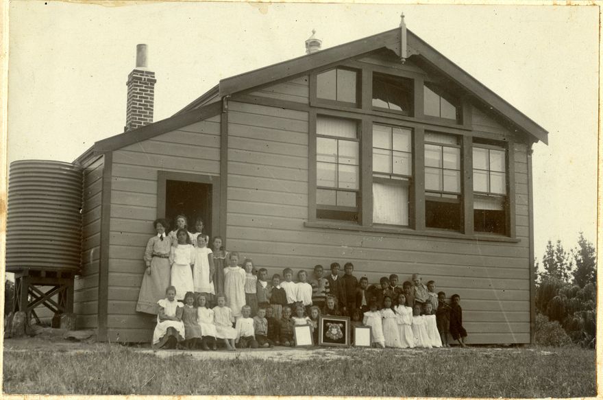 This image shows Miss Clara Hanron and the pupils of Tokorangi outside their new schoolroom, in 1908.