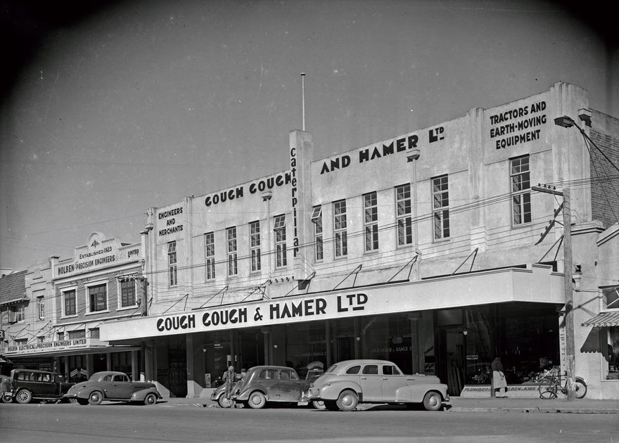 Gough, Gough and Hamer Ltd. started in 1929, initially selling electrical goods. By 1932, they had obtained the franchise for selling Caterpillar vehicles. In 1948, they gained the franchise for John Deere tractors and farm machinery. Shown here are their premises in Rangitikei street.