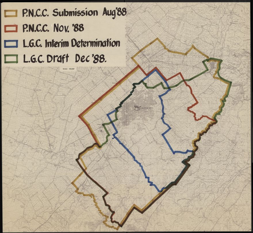 Topographical map showing boundaries proposed by the Palmerston North City Council (August and November 1988) and Local Government Commission (Interim Determination and Draft, December 1988. In 1989 there was New Zealand wide reform of Local Government. At the time about 850 local bodies were amalgamated into 86 local authorities, made up of regional and territorial levels.