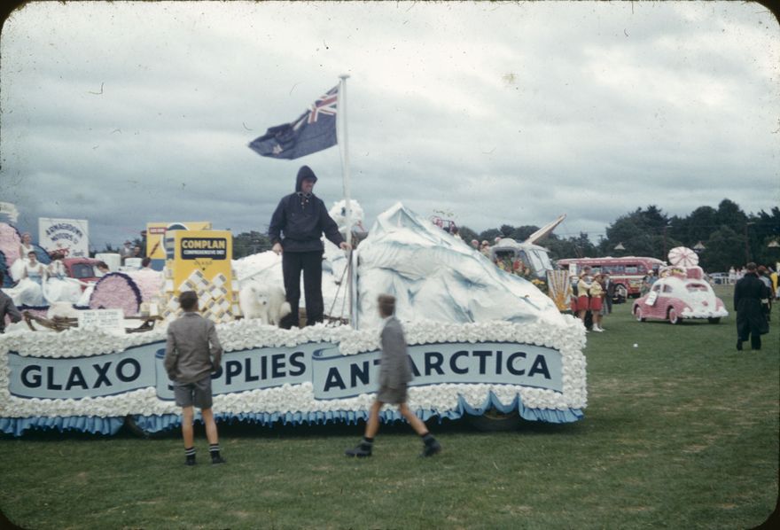 Glaxo's float advertised that they supplied expeditions to Antarctica with their product. The wooden sled on the float was said to be used by Captain Scott on his venture to Antarctica.