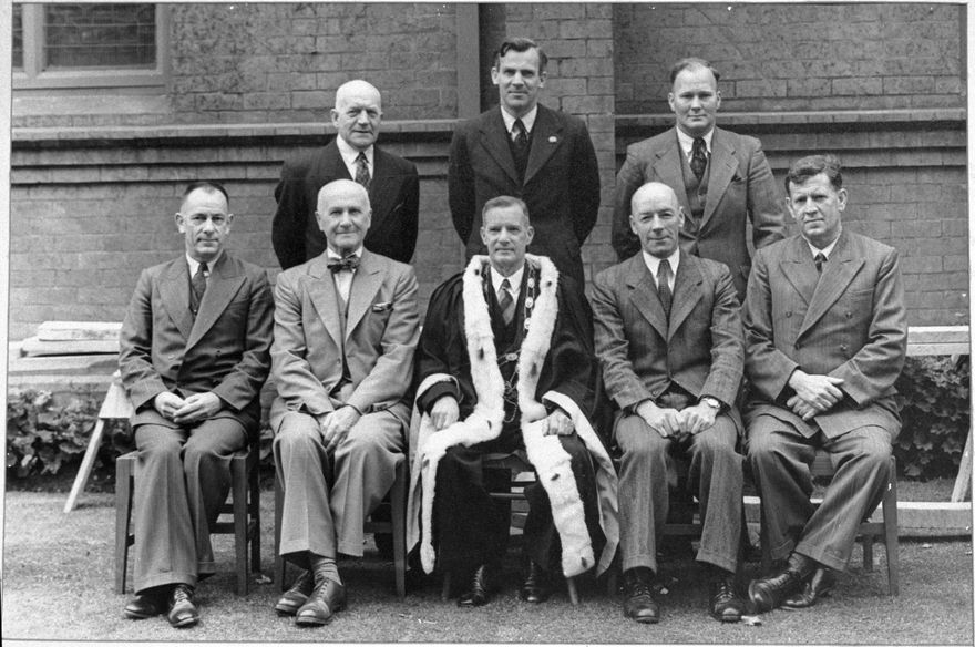 From left. Back row: A W Chapman - Bus Manager; P Hall - Assistant Town Clerk; McKenzie - Gas Manager. Front row: C Hands - Electrical Engineer; J R Hardie - Town Clerk; G Tremaine - Mayor; G Hogg - Engineer; D MacKenzie - Curator.