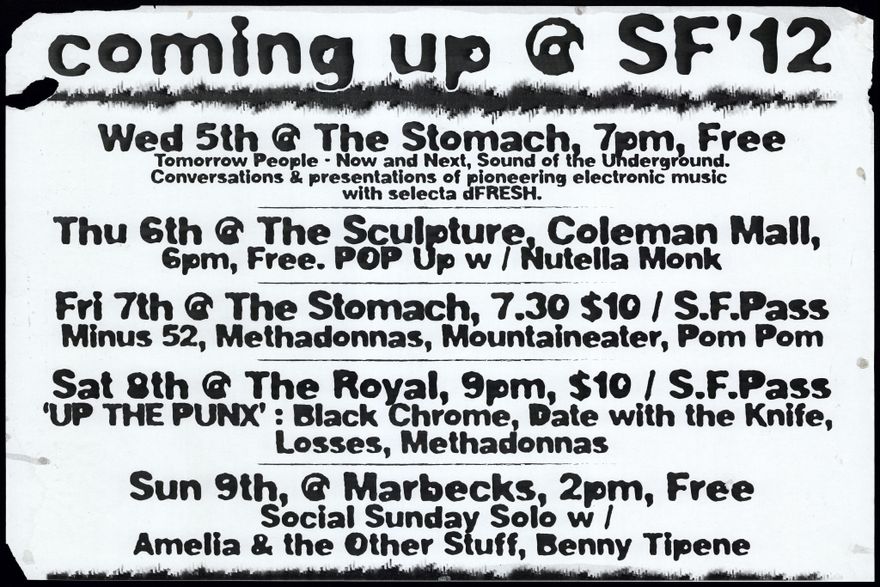 coming up @ SF'12. Wed 5th @ The Stomach, 7pm, Free. Tomorrow people - Now and Next, Sound of the Underground. Conversations & presentations of pionerring electronic music with selecta dFRESH. Thu 6th @ The Sculpture, Coleman Mall, 6pm Free. Pop Up w/Nutella Monk. Fri 7th @ The Stomach, 7.30 $10/S.F.Pass. Minus 52, Methadonnas, Mountaineater, PomPom. Sat 8th @ The Royal, 9pm, $10/ S.F.Pass. 'Up the Punx' : Black Chrome, Date with the Knife, Losses, Methadonnas.
