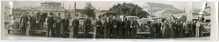 A photograph of Postal and Telegraph workmen photographed in front of their work vehicles on Main Street. Lines staff from Palmerston North drove to the Hawkes Bay to assist in the aftermath of the 1931 Napier earthquake. Fred Paxton is fourth from the left, he opened Reliance Motors on George Street in 1942.
