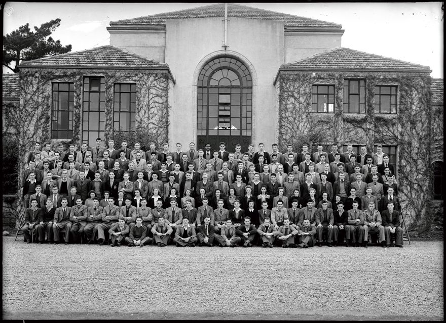 Massey Agrcultual College Students group photograph taken outside of the Refectory building at Massey College.