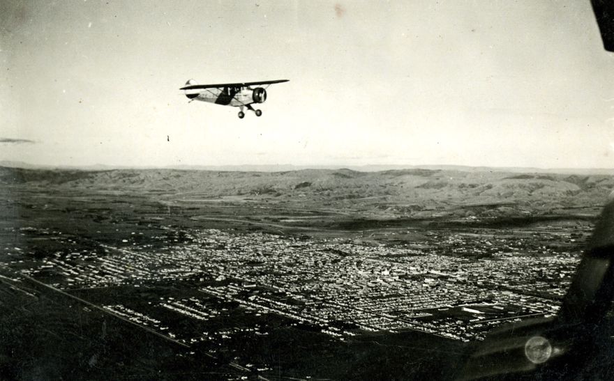 Beyond the city can be seen the Tararua Ranges. A Porterfield aeroplane accompanies the aeroplane from which the photograph was taken.