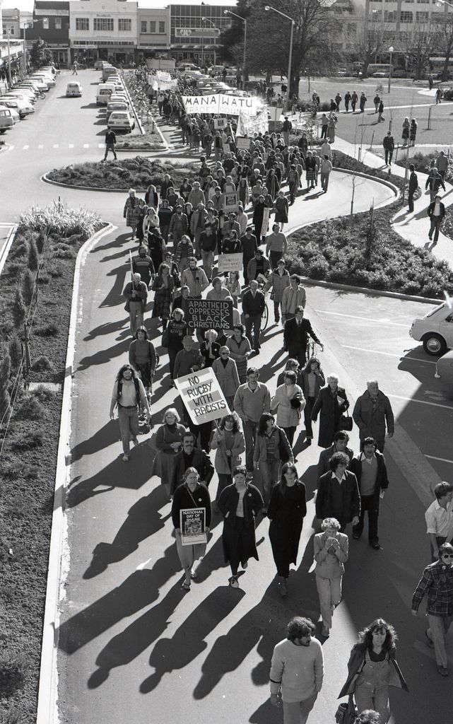 This image was taken for a story that ran in The Manawatu Evening Standard on 22 July 1981, with the caption: "Half mast flag marks 'shame' day: Palmerston North's anti-tour protestors marked New Zealand's 'National Day of Shame' with a peaceful march through the central City." The 'Day of Shame' march was the largest of several protest events before and after the Springbok Rubgy team played Manawatū in Palmerston North in 1 August 1981. The March moved from St Patrick's cathedral, down Broadway Avenue, circled the Square, ending in the 'Lion's Den' quadrant. 500 demonstrators began the march but the numbers may have swelled to 1000 by its end. The protesters were occasionally heckled by pro-tour members of the public. March chants included "Don't scrum with racist scum", and "We don't want your racist tour".