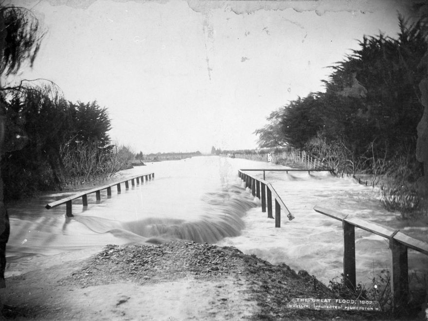 Shows flooding at the corner of Fitzherbert Avenue and Te Awe Awe Street.