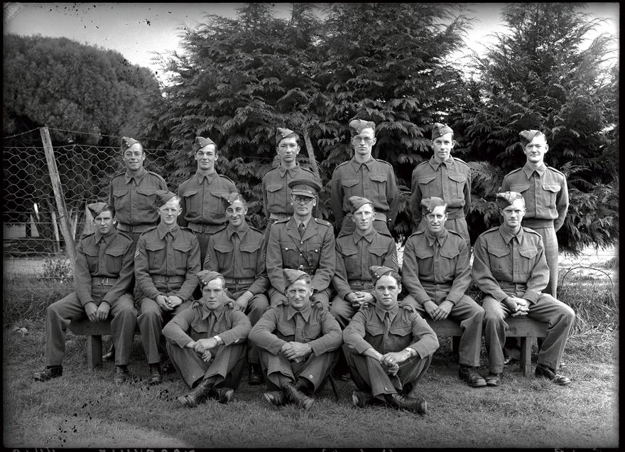 A group of Army personnel taken at the Woodville camp. Many Hawkes Bay regiments spent time in training at the Woodville racecourse.