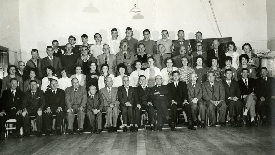 H L Young were printers of King Street. Patricia Hayes was employed as a showroom assistant, begining work for H L Young while at school (c1956) and then working full time on leaving school, The showroom sold all stationery goods, souvenirs and china. From left. Front row: Ray Blair (Showroom Manager); Harry Shepherd (Traveller); Unknown; Alfred Douglas (Factory Foreman); Skip Young (son of H L Young); Unknown; Basil Young (son of H L Young); Clarrie Dry (General Manager); Unknown; Unknown; Ian Shearer (Accountant); next 4 unknown. 2nd row: Bonnie Dillon; Unknown (man slightly behind); Pat Hayes (nee Eaton); Unknown; Unknown; Kath O’Neill; Margaret Young (daughter of H L Young); Sue Mickleson; next 5 Unknown; Jean Homer; Unknown; Judy Waugh; Jenny Hughes. 3rd row: Doug Riley; Claude Foster; Unknown; Len Moore; Unknown; Unknown; ? Whitehead; Unknown; ? Holdaway; Unknown; Unknown; Win Young (?); Unknown. Back row: Don Wills; next 4 unknown; Colin Young; Dick Redfern; Unknown; Unknown; Frank Prodger.