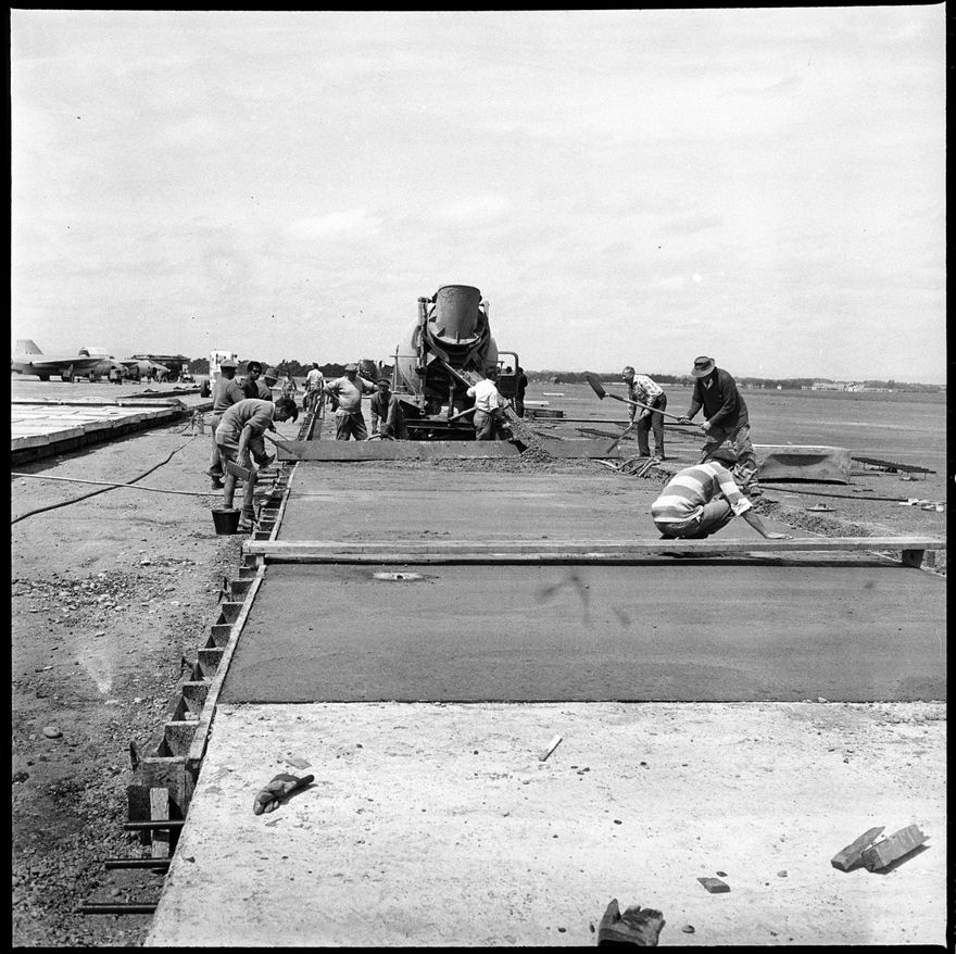This image was taken for a story that ran in The Manawatu Evening Standard on 23 February 1961 "Portions of the taxi-way at the R.N.Z.A.F. station at Ohakea are being strengthened to take much heavier loads. Heavy petrol tankers servicing jet aircraft have been adding extra weight to the tarmac."