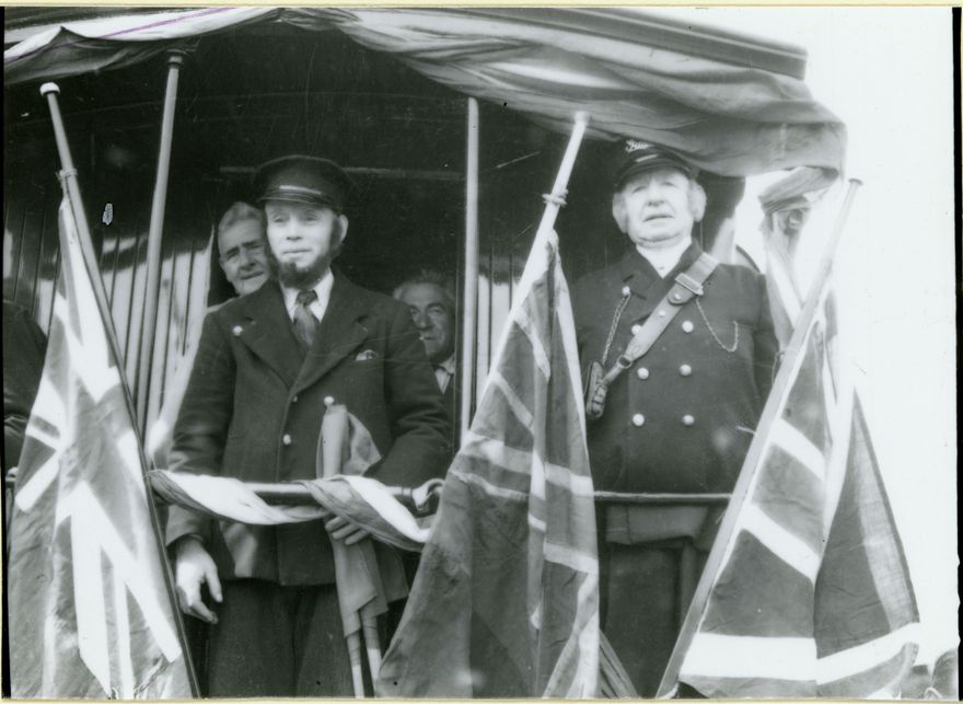 Palmerston North held its 75th Jubilee Celebrations during the week of 15th March 1952. The guard on the right may be Mr C White. These gentlemen are taking part in a re-enactment of the first train arriving in the town, which was a feature of the Jubilee celebrations.