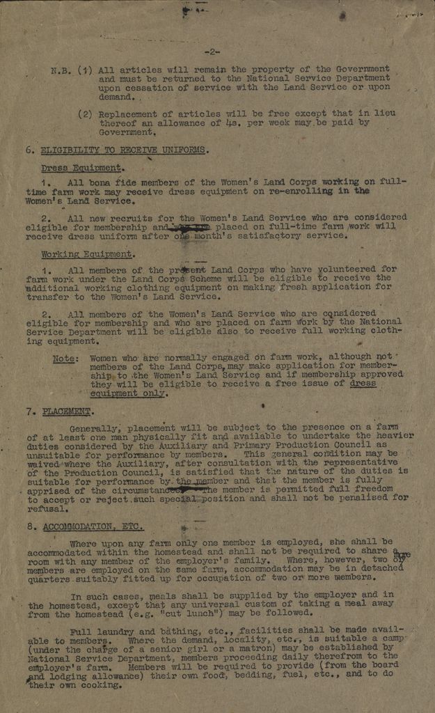 Rules of the Women's Land Service, part of the Women's War Service Auxiliary, dated 25/9/1942