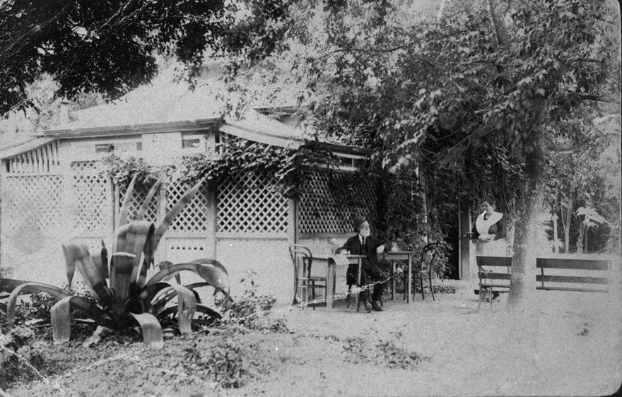 Development began on the Victoria Esplanade in Palmerston North, named to mark Queen Victoria's 60th jubilee, in 1897. A kiosk was built in 1909, with the lattice work additions added later, before 1917. It was demolished 1943. People identified as Maggie Leakey and Mr McLockland of Scotts Road, Tokomaru.