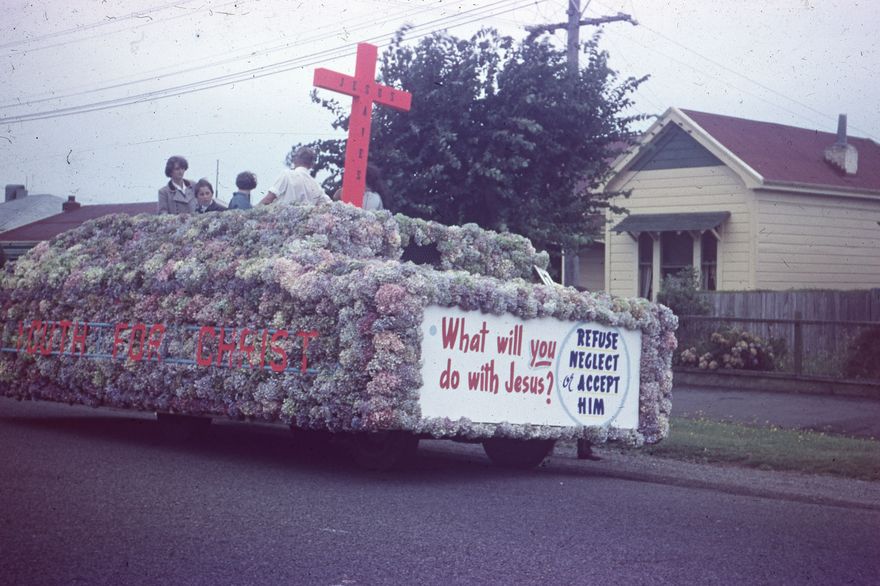 On February 25th, the Manawatu Evening Standard published a picture of the float in the Square near the clocktower with the caption: "Youth For Christ: Introducing a more serious aspect to the scene at the Showgrounds on Saturday was this float which was entered by members of the Youth For Christ Movement. The flaming cross was thrown into relief by the thousands of beautiful flowers which decorated the entry. this contribution to the Floral Festival gained first prize in the natural blossom section."