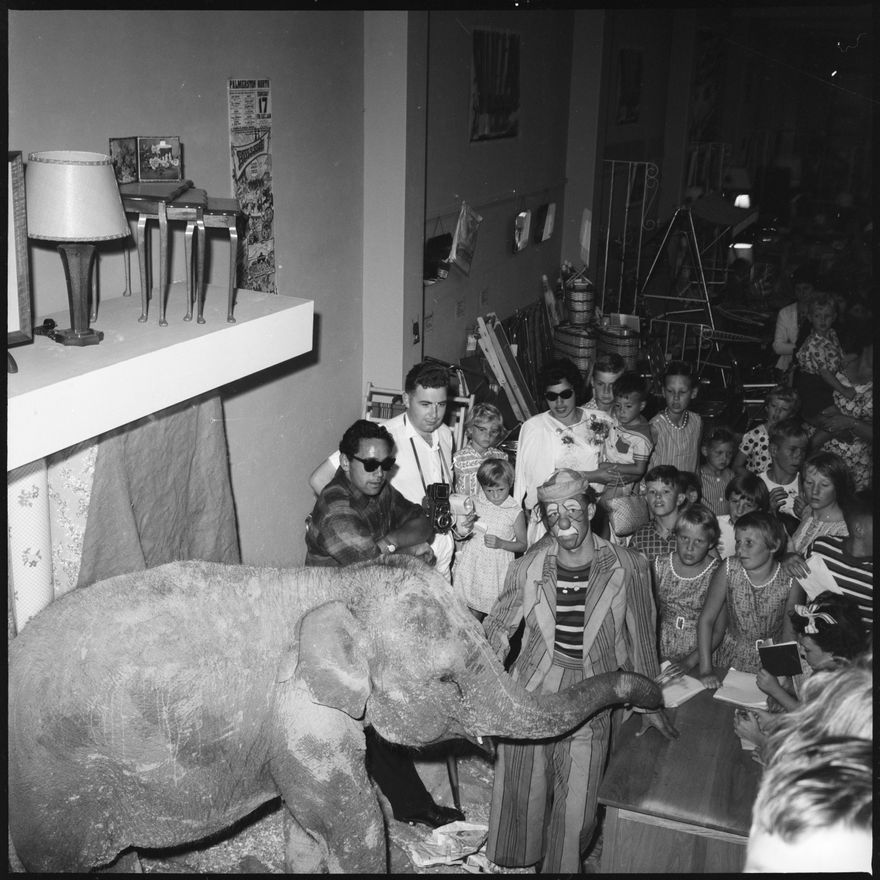 This image was taken for a story that ran in The Manawatu Evening Standard on 18th January, 1963. "You naughty elephant, Bimbo. That is what the children could be thinking when it was found that Bimbo had eaten the rubber stamp that he was to use to autograph children's books in a city store yesterday afternoon".