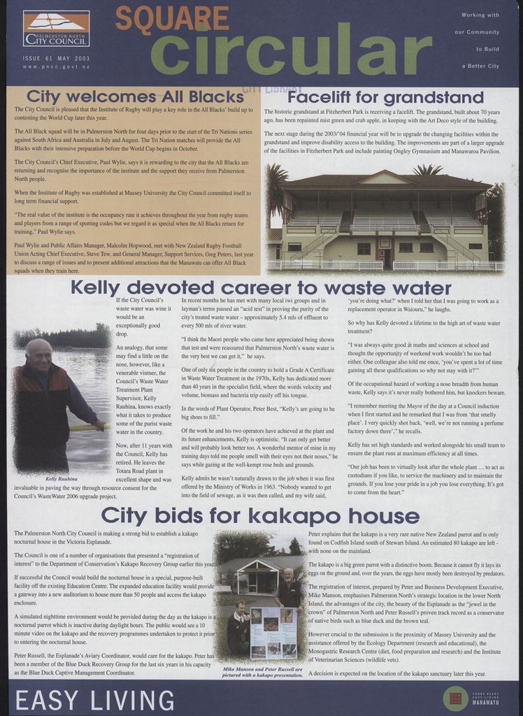 The Square Circular was Palmerston North City Council's monthly community publication, informing Palmerstonians of PNCC initiatives, activites, and events. This month's issue includes: All Blacks, Access Radio, Airport, Bio Commerce Centre, City Vision, civic honours, conservation, Destination Manawatū, draft policy on significance, electoral system, Fitzherbert park, graduates, grandstand, Jazz and blues festival, performing arts trust, roading, Sledge track, smoke alarms, Te Manawa, Victoria Esplanade, waste management, waste water.
