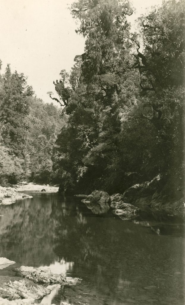 This photograph shows part of the Mangahao river. The Mangahao Power Station provides hydroelectric power and is situated near the town of Shannon. It serves Wellington, Horowhenua, Taranaki, Hawkes Bay, and the Wairarapa. After being delayed by the first world war construction began in late 1919 and the station opened in November 1924.