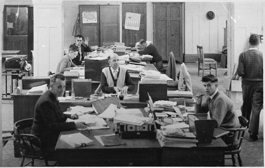 Officers of PNCC pictured at work in the Municipal Building, The Square. From left. Rear table: Bryan Weston (stores and vehicle transfers); Bill Dick (voucher payments); Colin McVicar (stores). Centre table: Arthur Matthews (salaries). Front table: Bert Newth and Bill Potbury (Wages). This building now operates as Square Edge, an arts and cultural centre.