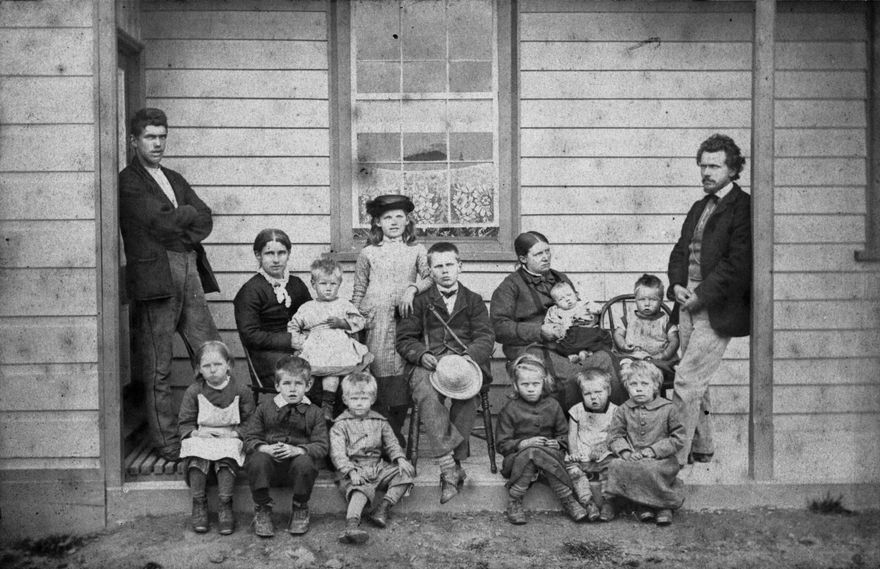 Bishop Ditlev Gothard Monrad, his wife, sons Viggo and Johannes and families came to the Palmerston North area from Denmark in October 1866 and settled at Karere, 3 miles from Longburn near Palmerston North. The Bishop was the former Premier of Denmark who left after finding himself the scapegoat for Denmark’s defeat in the war with Germany. Bishop Monrad returned to Denmark in 1869 and Viggo and his wife Olga continued on the farm. Olga died 1884 and Viggo returned to Denmark in 1889, leaving his sons, Oscar and Ditlev, farming. The photograph shows Viggo (far right) and Olga (seated with young child at left) Monrad and their children, and Johannes wife (seated with baby at right) and children, at Karere.
