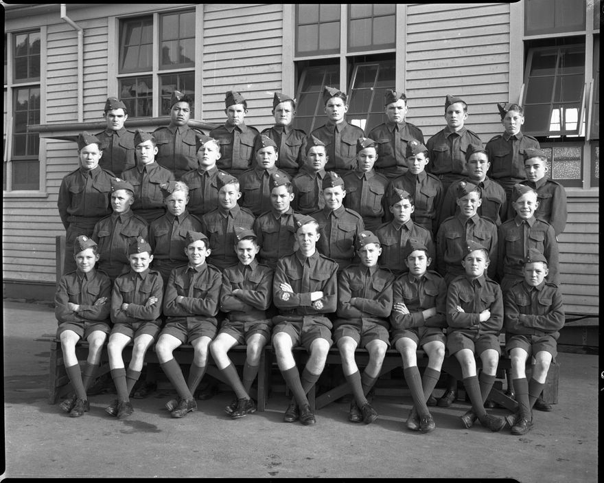 A group of about 35 male students pose in their cadets uniforms. The Palmerston North Technical High School was opened in September 1909 on what is now Princess Street, Palmerston North. In 1956 the school moved to the Rangitikei Street site and became known as Queen Elizabeth Technical College. The original building and site is now used by the Universal College of Learning [UCOL]. This negative comes from the Elmar Collection - a large series of semi-identified and unidentified images from the 1930s-1970s.
