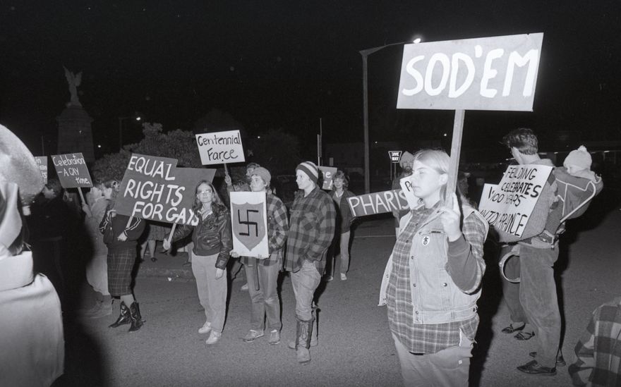 “Feilding Gay Task Force members flank the Salvation Army Centennial march through the town last night. About 15 to 20 task force members walked silently beside the march, letting their banners speak for them in their protest against the Salvation Army’s opposition to the Homosexual Law Reform Bill. Spokesman for the group Peter Pawson said the protesters were asked to stop, but the protest remained peaceful and non-violent.”