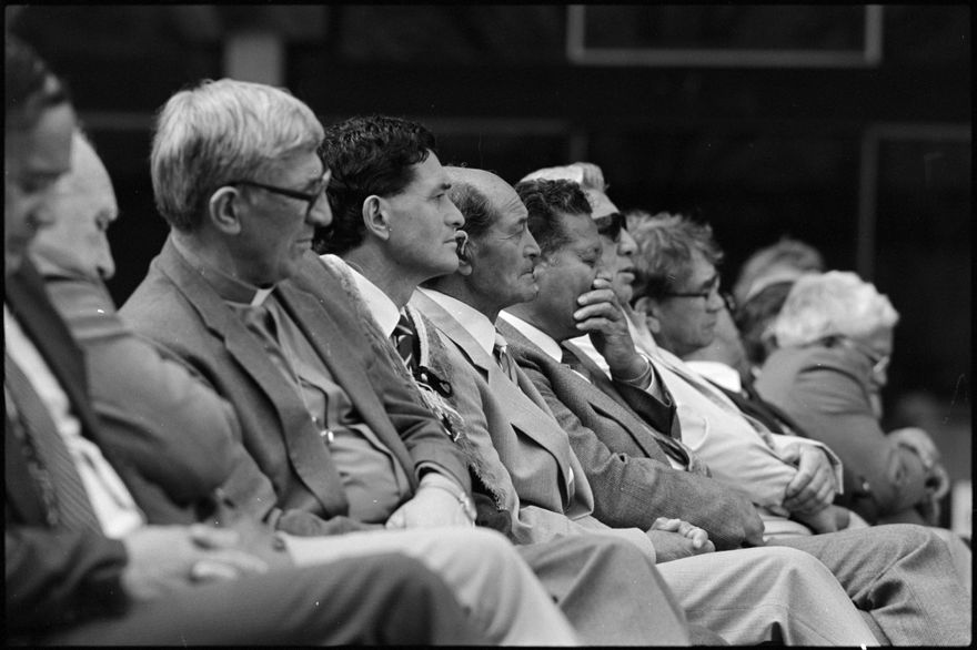 This image was taken by the Evening Standard on 17 September 1989 but was not published. It depicts professor Mason Durie during his welcome to Massey University as Professor of Māori Studies.