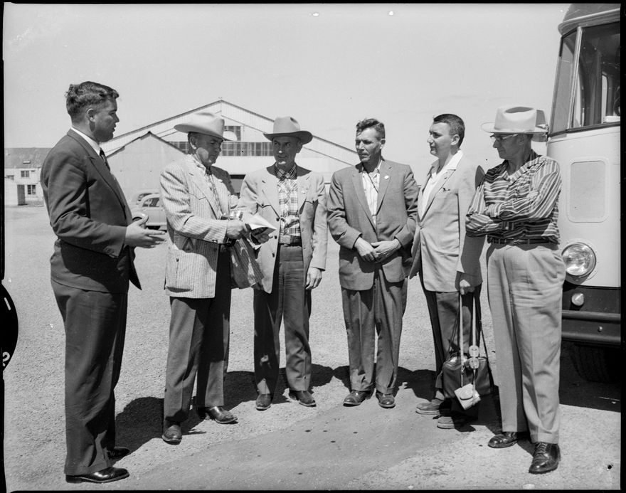 This image was taken for a story that ran in The Manawatu Evening Standard on 8 January, 1959. "A party of 17 Amercian woolgrowers paid a short visit to the city today in the course of a tour through New Zealand to study wool development in this country. They were met at the Palmerston North Airport this morning by the public relations officer (Mr M.R. Jensen) and later visited Massey Agricultural College. Some of the party are seen in conversation with Mr Jensen (left). They are (left to right): Messers H. [unreadable] (Wyoming), F. Roush (Wyoming), J Gilger (South Dakota), L. Nadasdy (Minnesota), leader of the party, and R. Jarrett (South Dakota)."