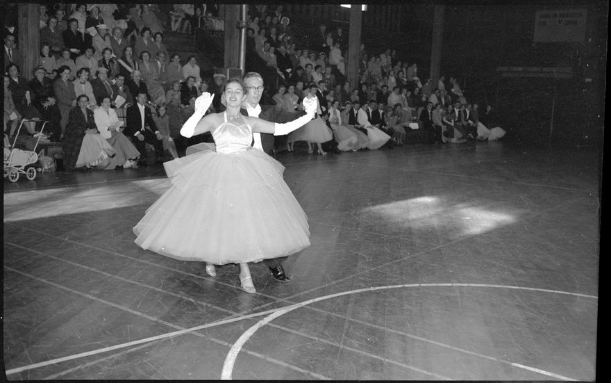 This image was taken for a story that ran in The Manawatu Evening Standard on 28 April 1958, page 13: "Miss Raima McDonald, of Rotorua partnered by Mr. R. Howe, is seen here dancing the charmaine during the gold old-time test, which took place in the Y.M.C.A. Stadium on Saturday."