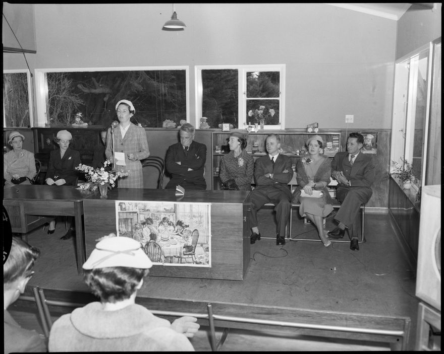 - This image was taken for a story that ran in The Manawatu Evening Standard on 24 May 1958, page 8: "Mrs. O.F. Haylock, president of the Palmerston North Free Kindergarten Association, introduces the Minister of Education (Mr. Skoglund), who opened the new Roslyn Kindergarten today. Others in the photograph are Mrs. F.B. Keys, representing the New Zealand Free Kindergartens Union and Cr. D.B. Black."