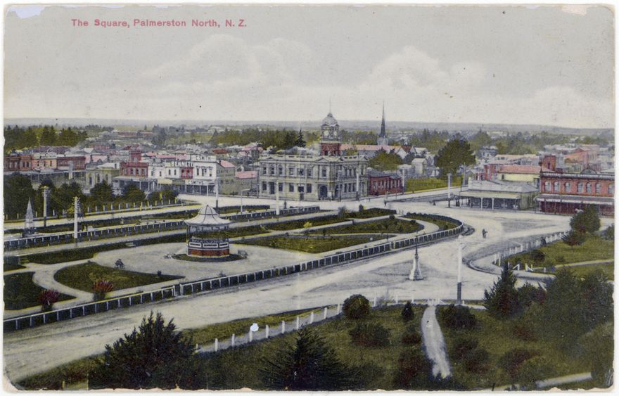 - This postcard shows The Square in the early 1900s with Main Street running off at centre top. During this time the railway ran down the centre of Main Street and through the centre of The Square, as seen behind the band rotunda. Prominent features of this postcard are the original band rotunda (centre left), built 1899 and moved to the Victoria Esplanade in 1907 and replaced, and the old Chief Post Office built in 1906(corner of Main Street East and The Square) now Highflyers Restaurant and Bar.